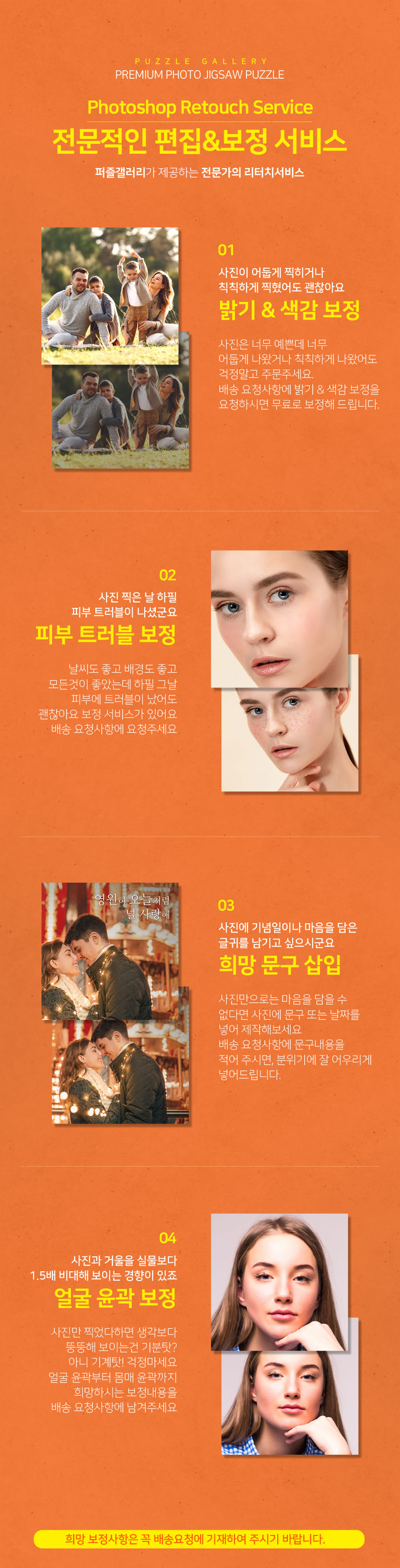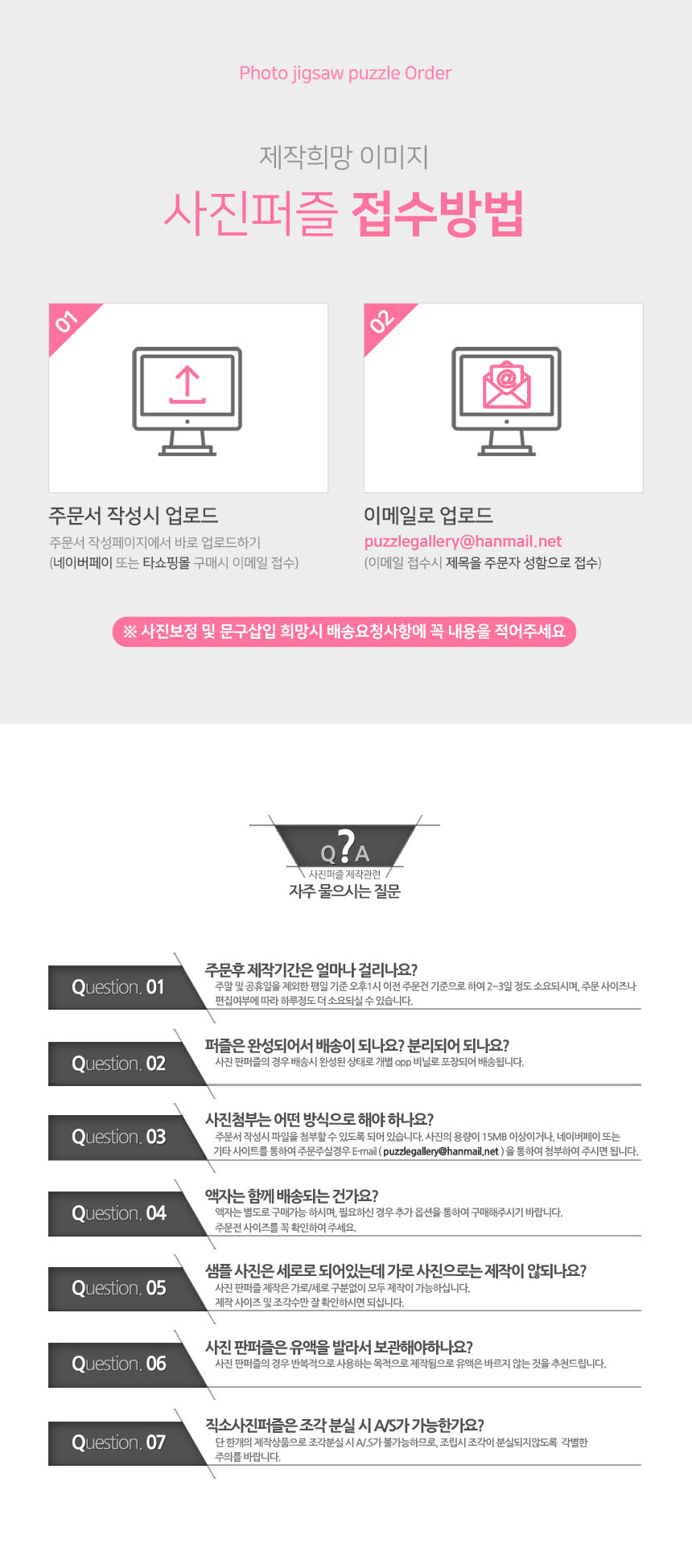 - 개별 주문제작상품(별도 제작 사이즈 액자, 사진을 이용한 제작품)의 경우에는 제작시작 및 완료, 인수 후에는 교환/반품기간내라도 교환 및 반품이 불가능 합니다.